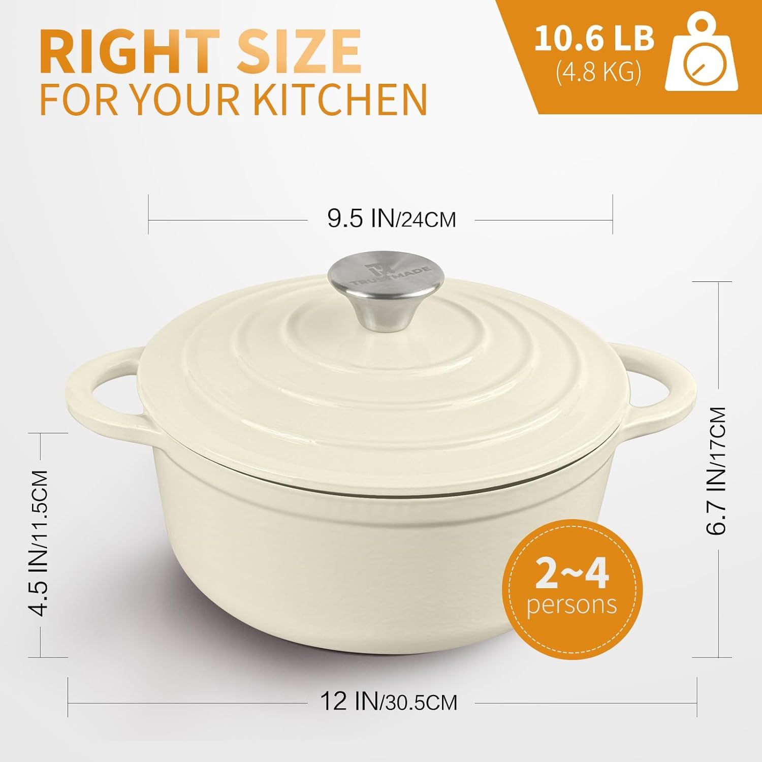 2.ELEGANT & SAFE ENAMEL COATING - Made of thick, heavy-duty cast iron with a glossy & gradient enamel finish and white, non-stick enamel interior. Elegant aqua creates a beautiful table scape for your kitchen. Trustmade dutch oven has exceptional heat conduction, retention, and distribution for reliable cooking