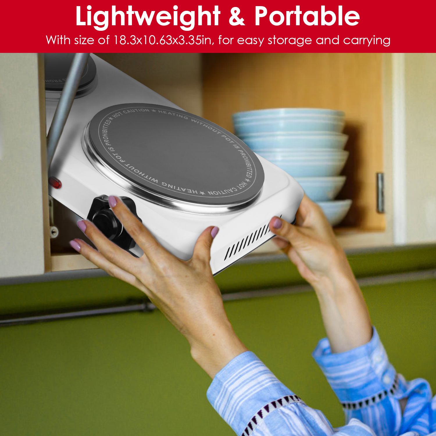 Heating Quickly & Evenly: Adopted with special infrared technology and equipped with 1000W Φ7.5in glass heating plate and 800W Φ6.3in glass heating plate, the Infrared Dual Burner heats up quickly and cooks food evenly without any hot or cold spots. Dual hot plates allow you to cook two dishes at the same time, saving you more time.