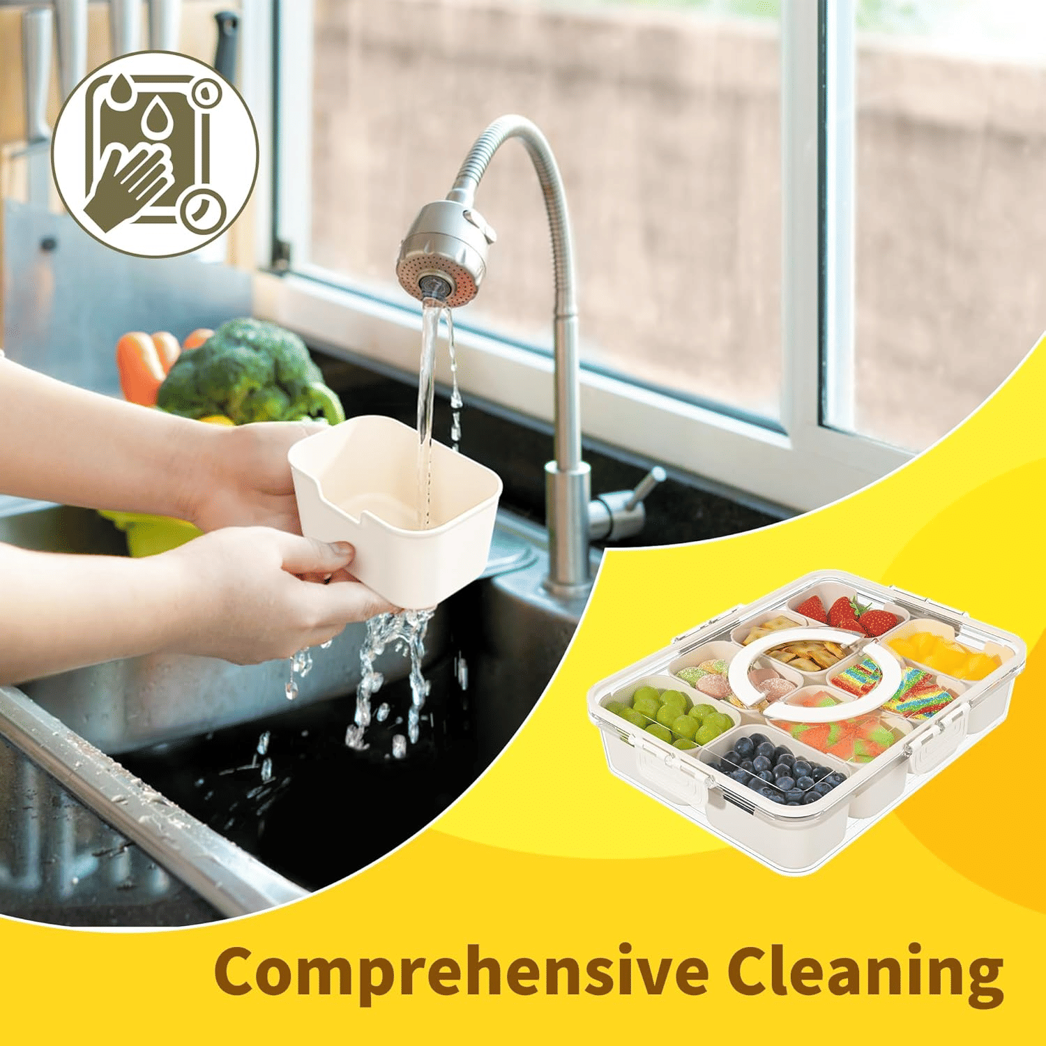 [Multi functional Snack Tray]Multifunctional partition fresh-keeping box that is perfect for storing snacks, fruits, vegetables, candies, nuts, and other snacks. The transparent design of the tray allows for quick and easy identification of the contents. It can also be used as an organizer for non food items and small accessories for daily life