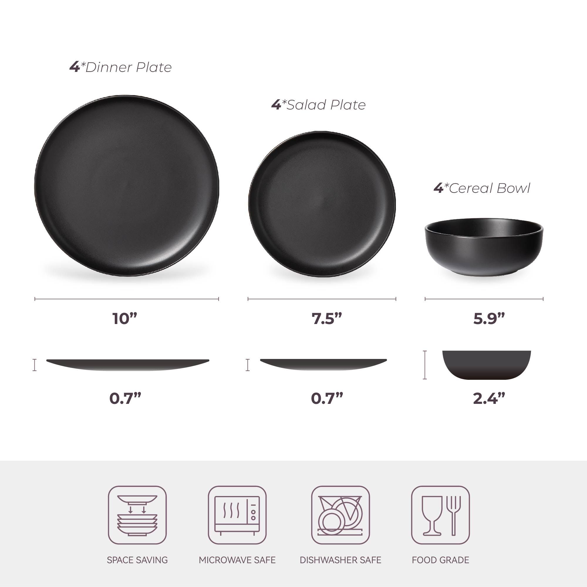 2. "[Complete 12pc Service for 4]": "Includes 4 dinner plates (10\"), 4 salad plates (7.5\"), and 4 deep cereal bowls (5.9\") - perfect for family meals or entertaining guests."