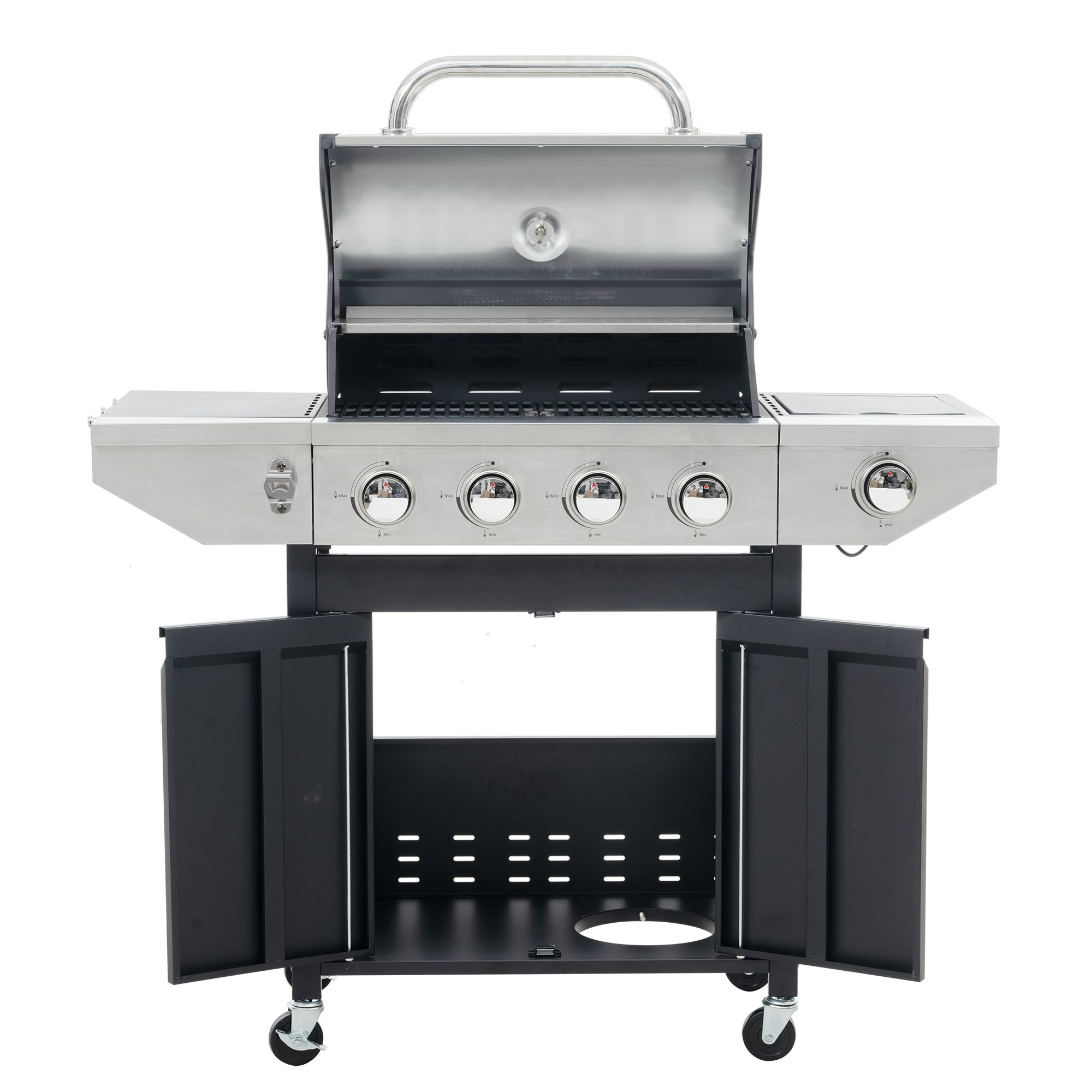 Each head can be independently fired, reliable side plate strength, stainless steel high temperature cover, side black powder, galvanized lining, cover with thermometer (round), stainless steel control panel, black body spray high temperature resistance 400, Fast & Even Heat: reliable enough to fire up burners immediately. with four wheels (two directional wheels, two steering wheels)